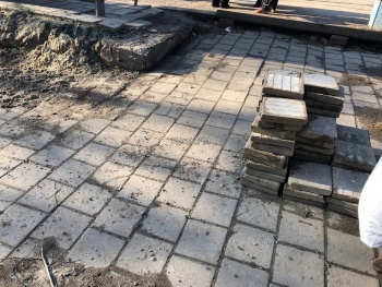 В конце января здесь начались работы. Сняли плитку и сложили стопкой у остановки, небрежно насыпали песок. На этом все и остановилось.