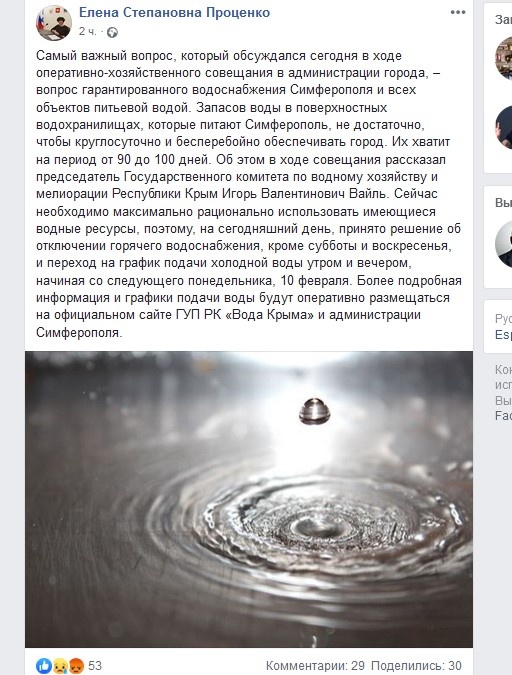 В Симферополе с 10 февраля вводят ограничения на подачу воды. Об этом на своей странице в соцсети написала глава городской администрации Елена Проценко, - передает Керчь.ФМ.