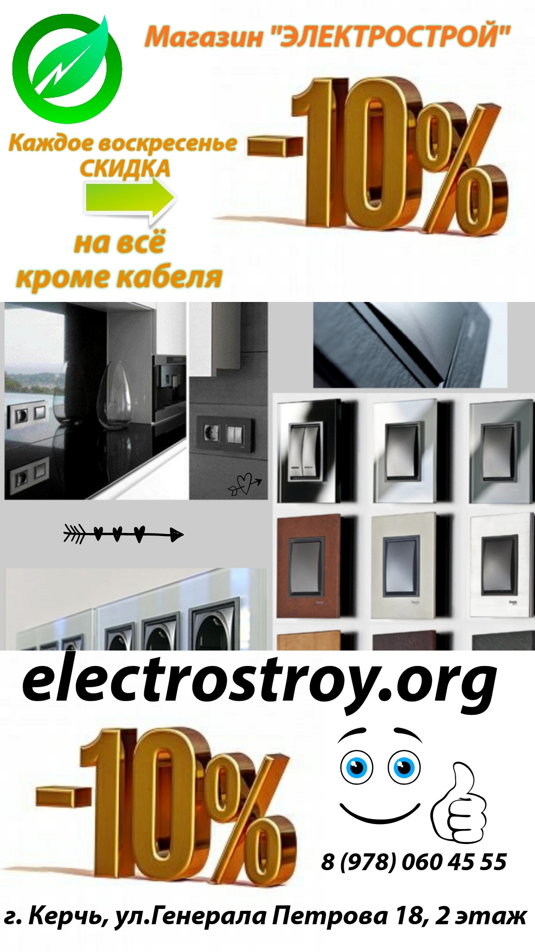 Каждое Воскресенье 10 % скидка на люстры, светильники, электротовары в магазине «Электрострой»!