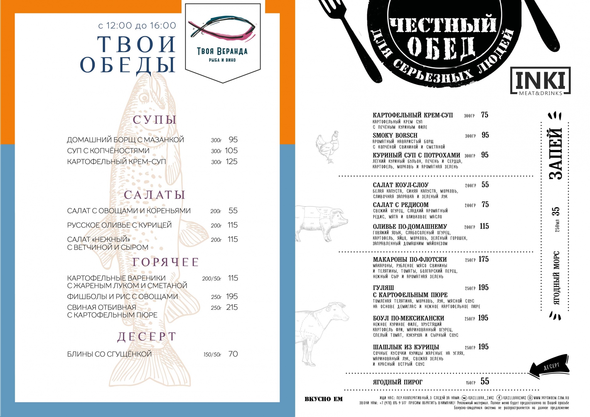 Каждую неделю с понедельника по пятницу с 12:00 до 16:00 «Твоя Веранда. Рыба и вино», Гриль-бар ИНКИ и городские пиццерии «J-Pizza» готовят сытные обеды по честным ценам!
