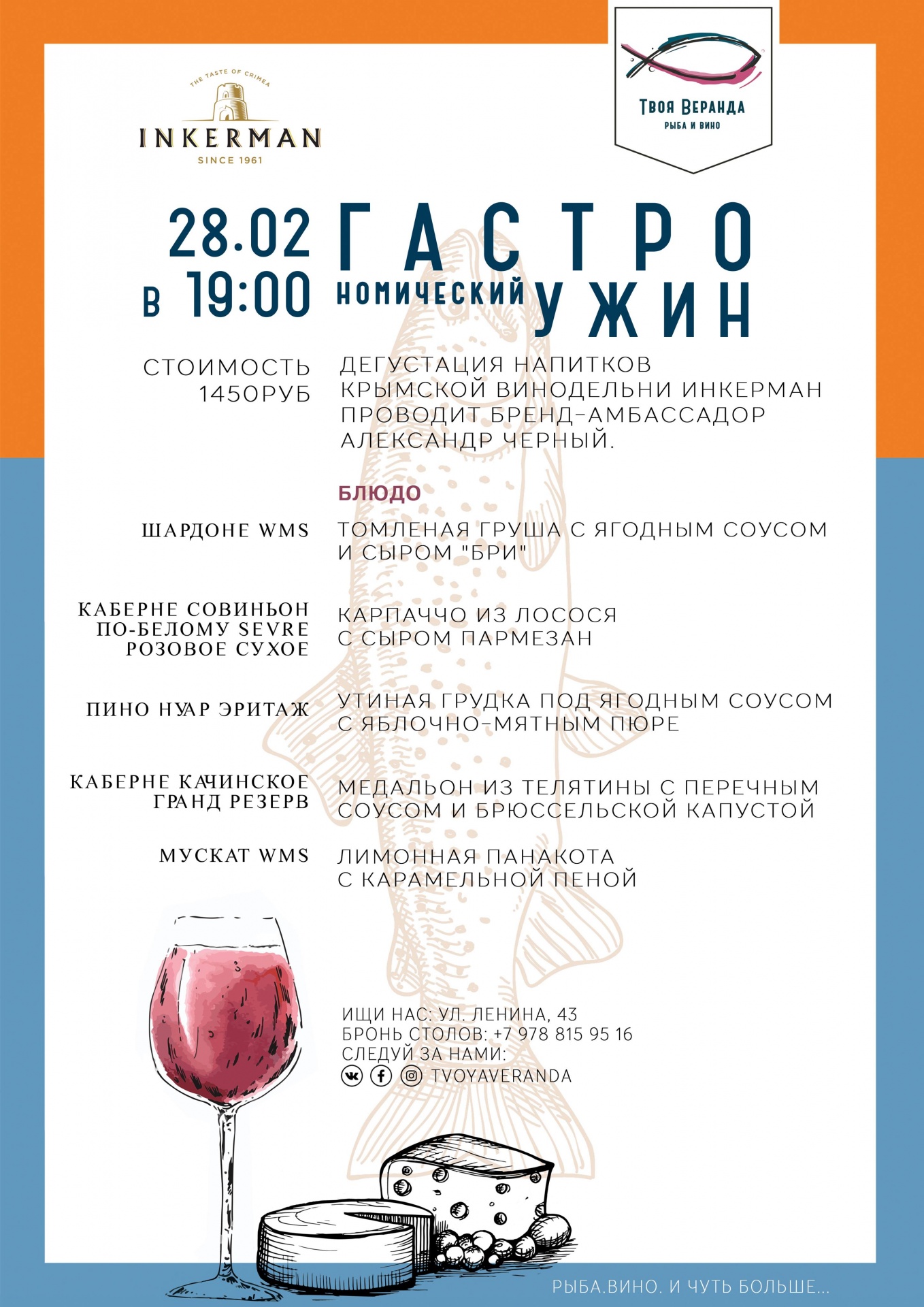 28 февраля, мы проведём вечер в компании бренд-амбассадора ИНКЕРМАН Александра Черного, который расскажет историю крымских виноградников, познакомит с правилами и культурой потребления данных напитков. Специальные блюда от Шефа раскроют ароматные нотки крымского винограда с новой стороны и станут гармоничным сопровождением нашего вечера: