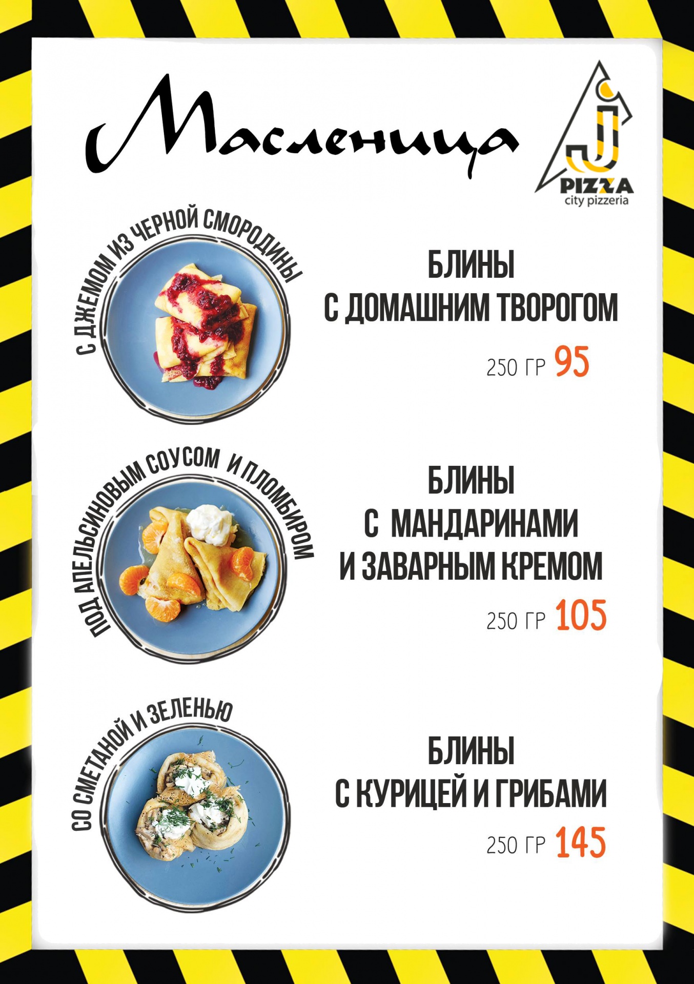 На десерт: Блины с домашним творогом и ягодным джемом из черной смородины, а также с мандаринами и заварным кремом - от 95 руб.
