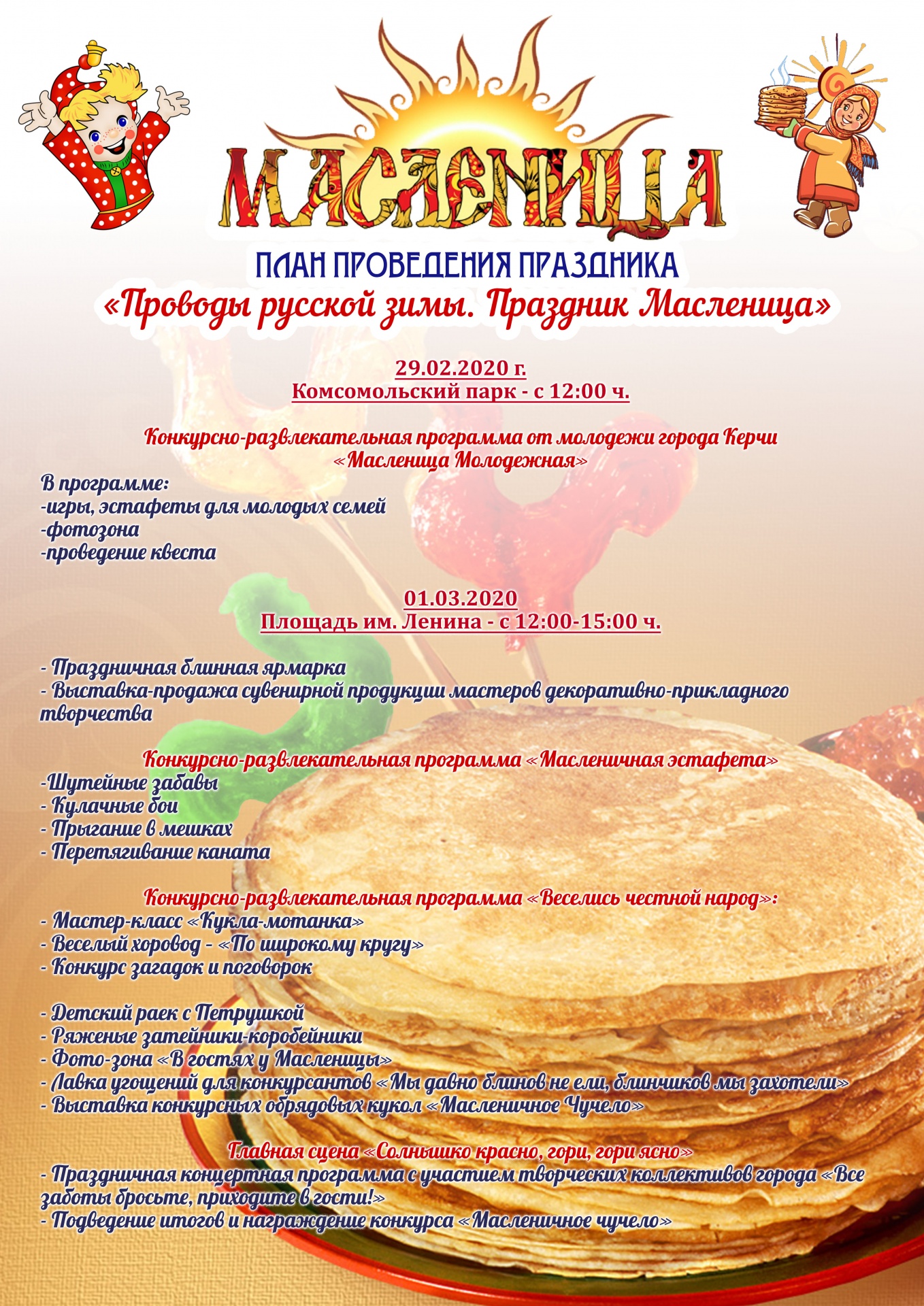В эти выходные 29 февраля - 1 марта пройдут праздничные мероприятия «Проводы русской зимы. Праздник Масленица». Об этом сообщает пресс-служба администрации Керчи, - передает Керчь.ФМ.