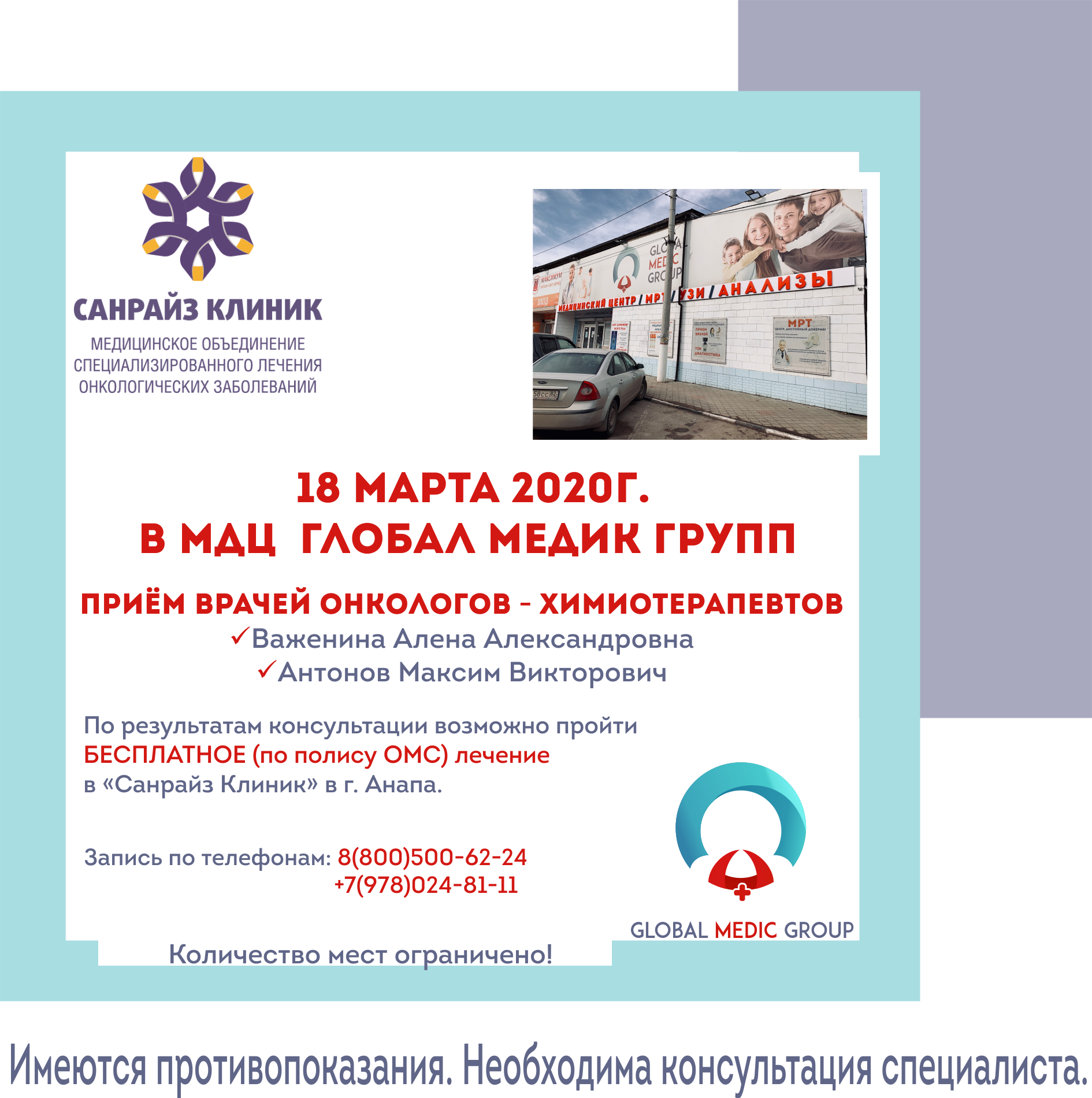 18 марта в медицинском центре «Глобал Медик Групп» будут вести приём врачи онкологи, химиотерапевты с медицинского объединения специализированного лечения онкологических заболеваний «Санрайз-Клиник» г. Анапа.
