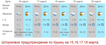 15 марта в Черном море: в Феодосии 10°, Алуште 9°, Ялте 10°, в р-не горы Карадаг 9°, в Севастополе 10°, Евпатории 10°, Черноморском 7°, в Керченском проливе 8°, в Азовском море 8°.