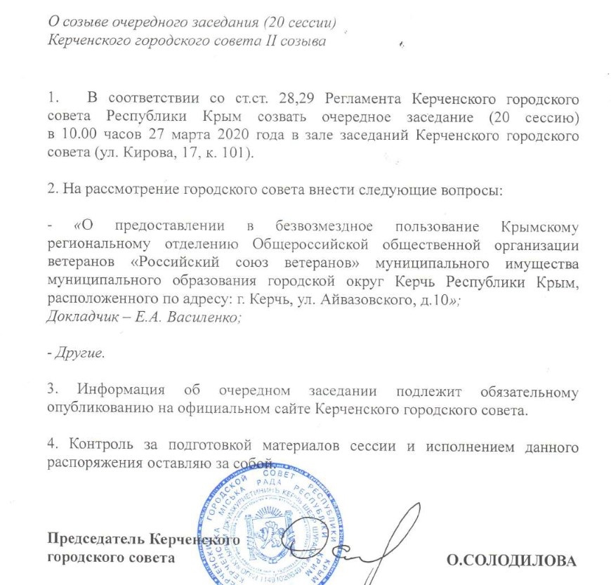 Очередная 20 сессия Керченского городского совета 2 созыва состоится в 10.00 часов 27 марта.