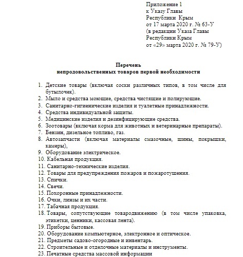 В Указ Главы Республики Крым от 17 марта 2020 года № 63-У внесли еще ряд изменений 29 марта. Как и обещали, закрыли деятельность «наливаек» и ломбардов, а также расширили список непродовльственных товаров первой необходимости.
