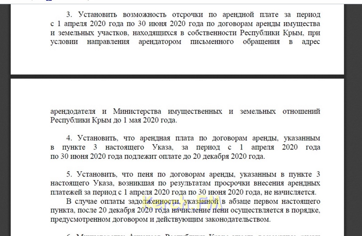 Так, согласно Указу главы Крыма от 25 марта 2020 года № 75-У «О первоочередных мерах поддержки субъектов малого и среднего предпринимательства Республики Крым в связи с осуществлением мер по противодействию распространению на территории Республики Крым новой коронавирусной инфекции 2019-nCoV», предоставлять отсрочку по оплате за аренду госимущества РК с 1 апреля по 30 июня 2020 года, которую можно будет оплатить до 20 декабря текущего года. Относительно же  аренды муниципального имущества, то Указом даны рекомендации принять аналогичные меры.