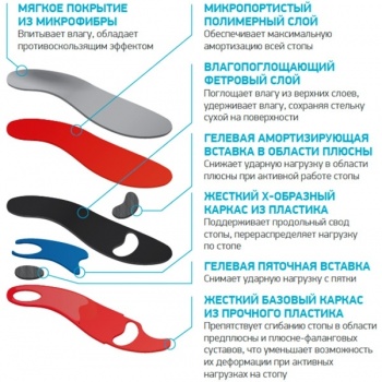 Стельки имеют выраженный анатомический рельеф и разработаны специально для профилактики и коррекции продольного и поперечного плоскостопия при активных нагрузках на стопы.