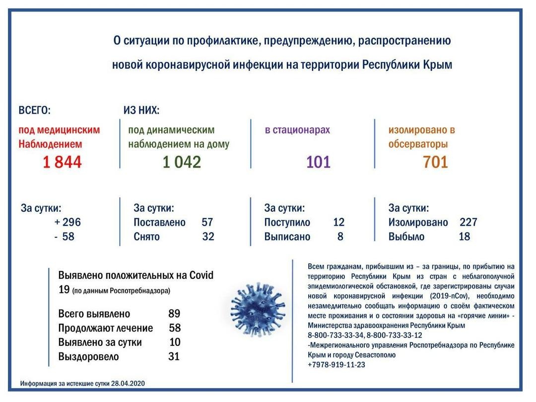 Число граждан, которые попали под медицинское наблюдение в связи с коронавирусом, снова возросло в Крыму и превысило 1, 8 тыс человек, в стационарах находятся 58 человек с подтвержденным диагнозом COVID-19. Об этом в ходе оперативного штаба по вопросу предупреждения распространения новой коронавирусной инфекции в Республике Крым сообщила вице-премьер - министр труда и соцзащиты Елена Романовская. - передает Керчь.ФМ.