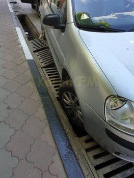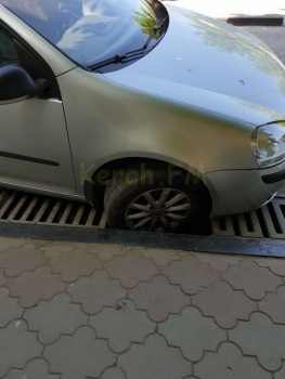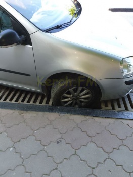 На Козлова в Керчи машина провалилась в ливневку. Об аварийном состоянии проезжей части, в частности отсутствии металлических секций, редакция Керчь.ФМ писала неоднократно.