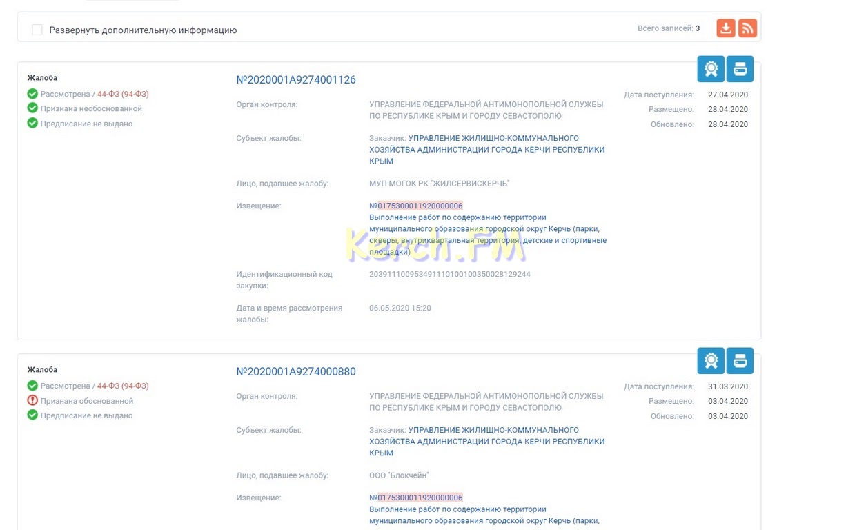 Тем временем, ООО "Жилсервискерчь" не признал свой проигрыш и тоже подал в ФАС свою жалобу, но уже 27 апреля. Жалоба была признана антимонопольным комитетом необоснованной, о чем размещен контроль 15 мая. При этом, "Жилсервискерчь" просил ФАС вообще аннулировать закупку и принять решение, которым вернуть все на этап подачи заявок. Если бы это было сделано, то парки до сих пор никто бы не убирал.