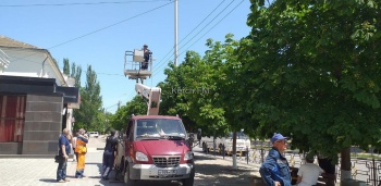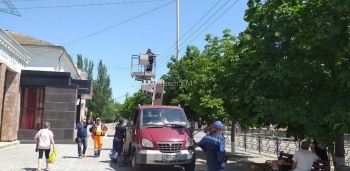 На месте находятся работники культуры и горсвета. Сейчас развешивают трансляционное оборудование к Параду.
