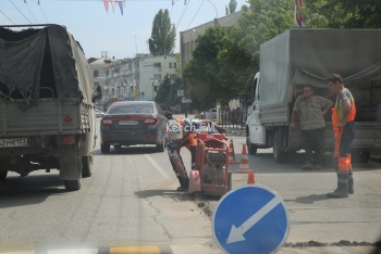 В Керчи 11 июня, на 15:10 часов, затруднено движение транспорта по улице Кирова, в районе гостиницы «Керчь». Рабочие с помощью спецтехники вырезают асфальт. Перед работами установили предупреждающие дорожные знаки, - передает Керчь.ФМ