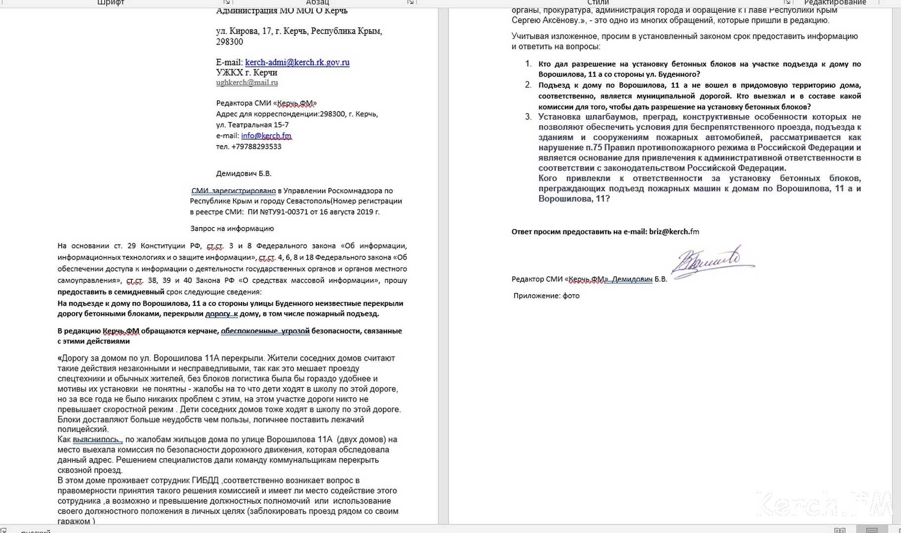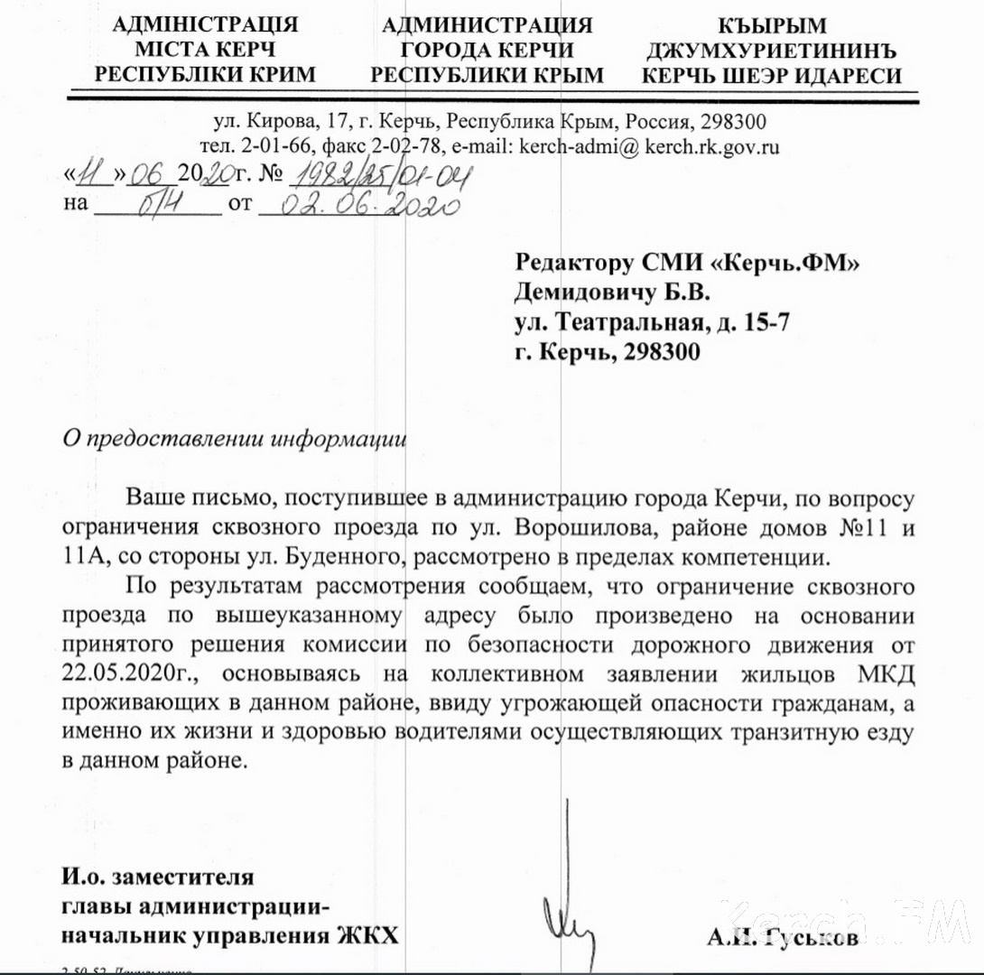 « Ваше письмо, поступившее в администрацию города Керчи, по вопросу ограничения сквозного проезда по улице Ворошилов, районе омов № 11 и 11А, со стороны Буденного, рассмотрено в пределах компетенции».