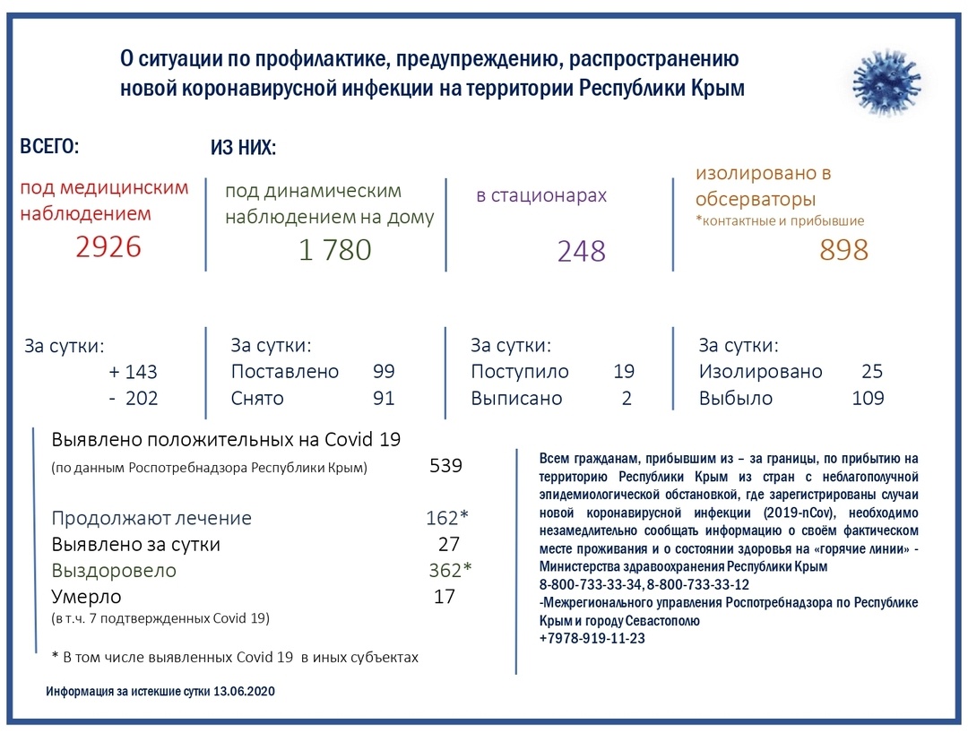 Ранее глава Крыма Сергей Аксёнов сообщил, что новая коронавирусная инфекция зарегистрирована за истекшие сутки в Крыму у 27 человек. Всего на территории Крыма с начала пандемии зарегистрировано 539 случаев COVID-19, с выздоровлением из больниц выписаны 362 пациентов.
