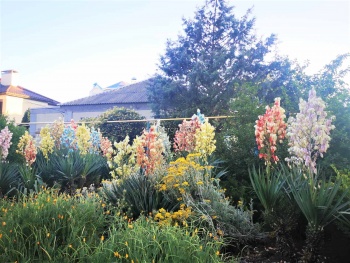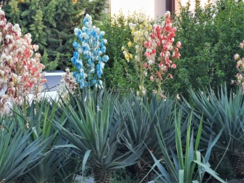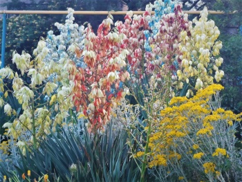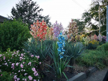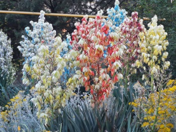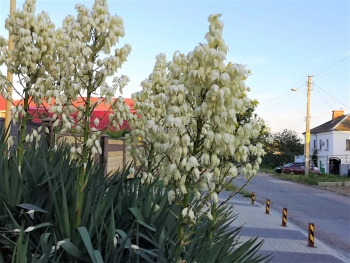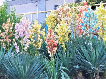 В Керчи по ул. Московской появилась необычная клумба, которая сильно привлекает внимание прохожих, - передает Керчь.ФМ. Дело в том, что здесь растут экзотические юкки. У растения цветки белые, но хозяева решили сделать клумбу более яркой и разукрасили их разными цветами.