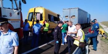 «По предварительной информации, сегодня около 5 часов утра на авто трассе "Таврида" в районе поворота на село Русаковка Белогорского района произошло ДТП, в котором погибли 8 человек и ещё 5 получили телесные повреждения. Информация о количестве пострадавших будет уточняться. По предварительной информации, микроавтобус, который двигался из г. Краснодара в г. Севастополь, столкнулся с грузовым автомобилем. Микроавтобус является маршрутным транспортным средством. Погиб водитель и 7 пассажиров микроавтобуса. На месте работают сотрудники ГИБДД. Проводятся неотложные следственные действия, в том числе с участием экспертов-автотехников. Следственным управлением МВД по Республике Крым возбуждено уголовное дело по ч 5 ст. 264 УК РФ.