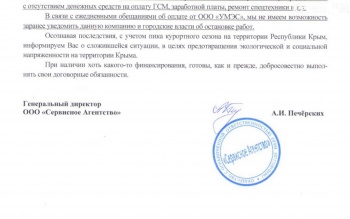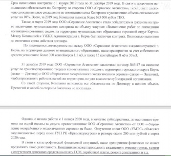 «С начала работы с 1 января 2020 года в качестве субподрядчика до настоящего времени ни одной оплаты за услуги, предоставленные ООО «Сервисное агентство» от ООО "УПРАВЛЕНИЕ МЕЖРАЙОННОГО ЭКОЛОГИЧЕСКОГО СЕРВИСА" не было. Отсутствие оплат ООО «УМЭС» объясняет задолженностью перед ними ГУП РК «Крымэкоресурсы» в размере около 200 млн рублей с марта 2020 года