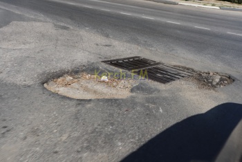 Такая же выбоина и провал образовались в районе ливневки на этом же перекрестке. Теперь уже водители, которые поворачивают с моста направо в сторону порта рискуют остаться без колеса в лучшем случае.
