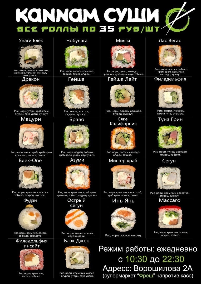 В нашем меню 22 вида роллов кусочками по 35 р. шт.!!!