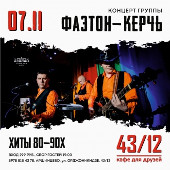 Почему бы и ДА?! Ностальгия взяла свое! Не забыли, что завтра - 7-ое ноября, красный день календаря? Приглашаем Вас и Ваших близких на концерт группы «Фаэтон-Керчь». Легендарные хиты 80-90х, праздничная атмосфера и отличное настроение гарантируем!