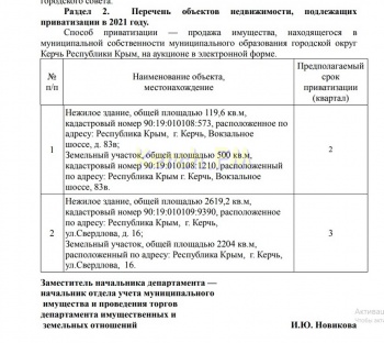 На прошедшей вчера сессии горсовета керченские депутаты приняли план работы на 2021 год. Приватизации подлежат бывший недострой милиции на участке 2204 кв.м. в самом центре города и нежилое здание с земельным участком, - передает Керчь.ФМ.