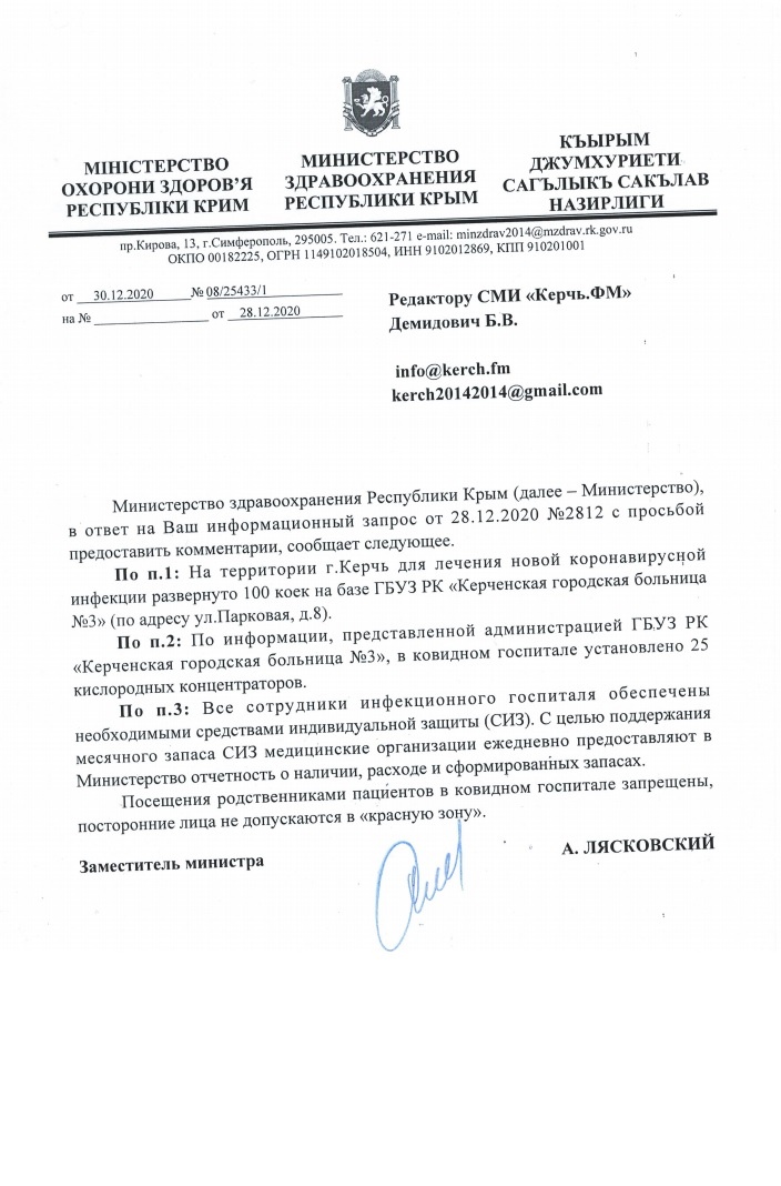 Минздрав Крыма подтвердил информацию о том, что на территории Керчи для лечения новой коронавирусной инфекции развернуто 100 коек на базе ГБУЗ РК «Керченская городская больница № 3» (по адресу ул. Парковая, 8. Такой ответ пришел на поданный редакцией Керчь.ФМ информационный запрос.