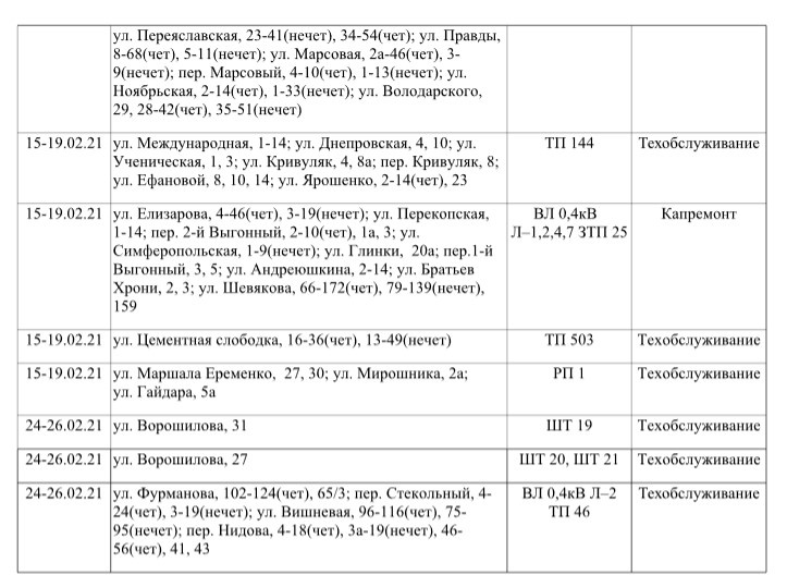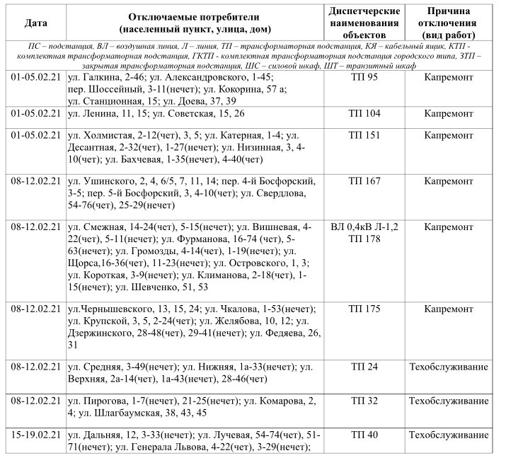 В связи с плановым ремонтом электрооборудования в феврале в период с 8 до 17 часов будут происходить отключения линий электропередачи согласно нижеприведенному графику. Об этом сообщает ГУП РК «Крымэнерго», - передает Керчь.ФМ.