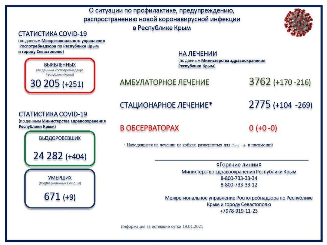 По информации Минздрава Крыма, всего в Крыму выявлено 30205 положительных на Covid-19. Выписано с выздоровлением - 24282.