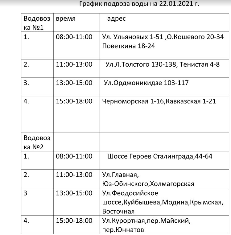 ГУП РК «Вода Крыма» сообщает  график подвоза воды населению на 22.01.2021г.