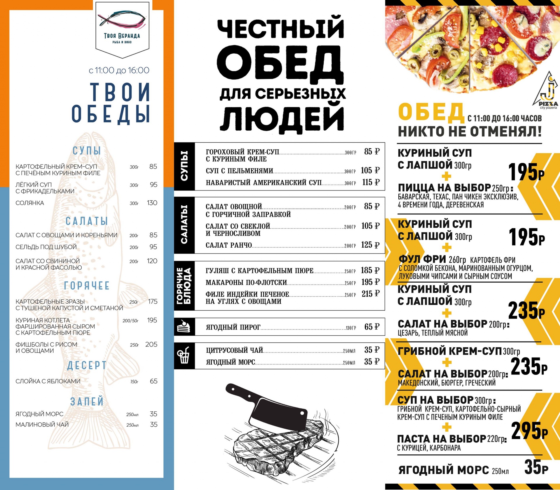 Супы: картофельный крем-суп с печеным куриным филе, легкий суп с фрикадельками, солянка - от 85 руб.