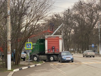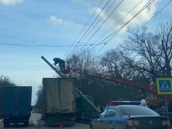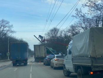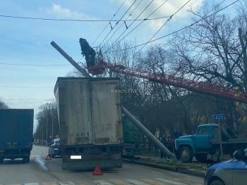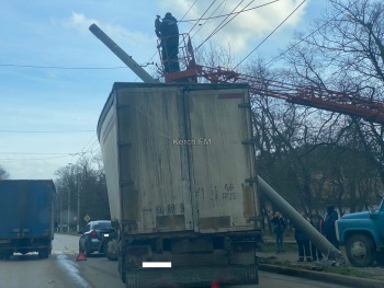 В Керчи 29 января, около 14.00 на ул. Войкова произошла авария. Как передает корреспондент Керчь.ФМ с места происшествия, Шевроле притормозил перед пешеходным переходом, фура не успела, врезалась в столб и ударила Шевроле. На фуру упала электроопора, произошел порыв проводов.