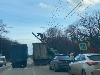 По состоянию на 15.00 работает бригада, которая поднимает опору с фуры. Авария произошла перед пешеходным переходом.