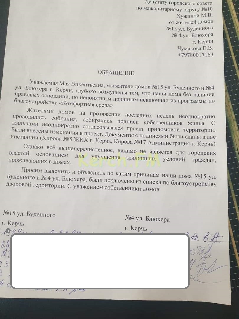 По состоянию на начало года в Керчи планировали благоустроить 16 дворовых территорий. На совещании по ФЦП от Керчи озвучили подлежащими благоустройству 12 дворов. Арифметики ради нетрудно посчитать, что 4 двора за московские деньги благоустраивать не будут. В число таких «счастливчиков» попал и огромный двор Буденного, 15 - Блюхера, 4. Жители двора написали коллективное письмо на имя керченского депутата, Главы Крыма, председателя Госсовета Крыма. Копия письма есть в редакции Керчь.ФМ.