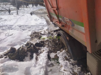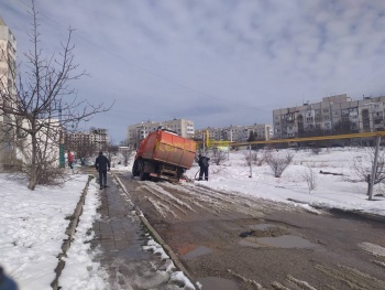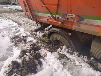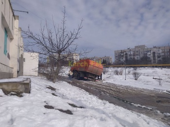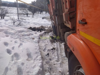 Сегодня, 22 февраля, около 12 часов, КамАЗ провалился в яму, оставленную после себя коммунальными службами. Машина застряла в яме и наклонена в сторону газовой трубы, - передает Керчь.ФМ.