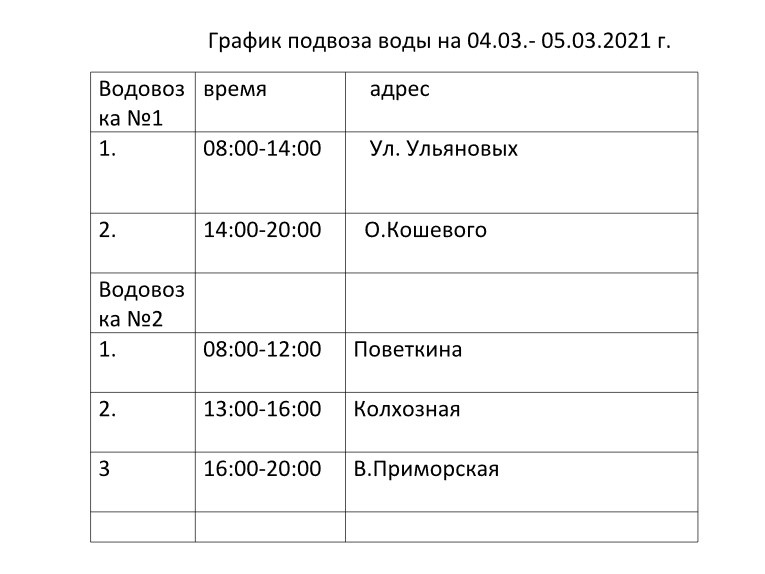 На период отключения воды в вышеуказанном районе будет организован подвоз воды автоцистернами, согласно графика подвоза, 4.03-05.03 2021г с 08-00 до 20-00.