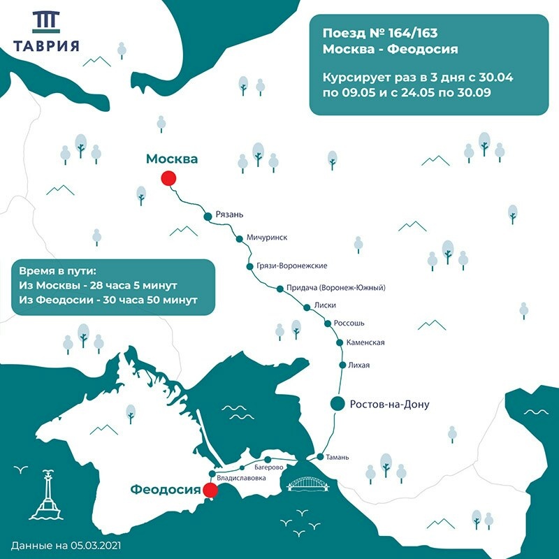 «Компания «Гранд Сервис Экспресс» открывает новое направление движения поездов «Таврия» на полуостров в Крым и обратно. Поезд №164/163 Москва - Феодосия будет курсировать раз в три дня в период с 30 апреля по 9 мая и с 24 мая по 30 сентября и следовать через Рязань, Мичуринск, Придачу (Воронеж-Южный), Ростов-на-Дону и Владиславовку. Время в пути составит 28 часов», - говорится в сообщении.