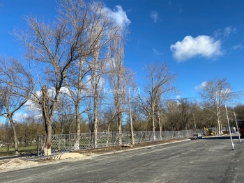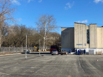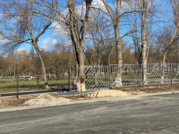 Въезд авто на территорию закрыт. Также, рабочие устанавливают новый забор со стороны парка и укладывают плитку.