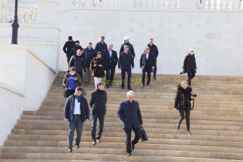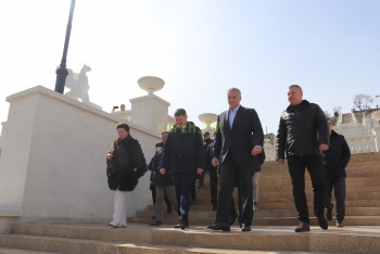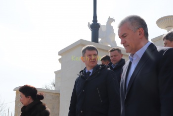 Глава Крыма Сергей Аксенов с рабочим визитом приехал инспектировать объекты строительства. После встречи Главу Крыма подняли на машине на Митридат, а оттуда своим ходом по отремонтированной, но никак не открытой для людей, Митридатской лестнице. Затем ему показали процесс реконструкции Романовской гимназии.