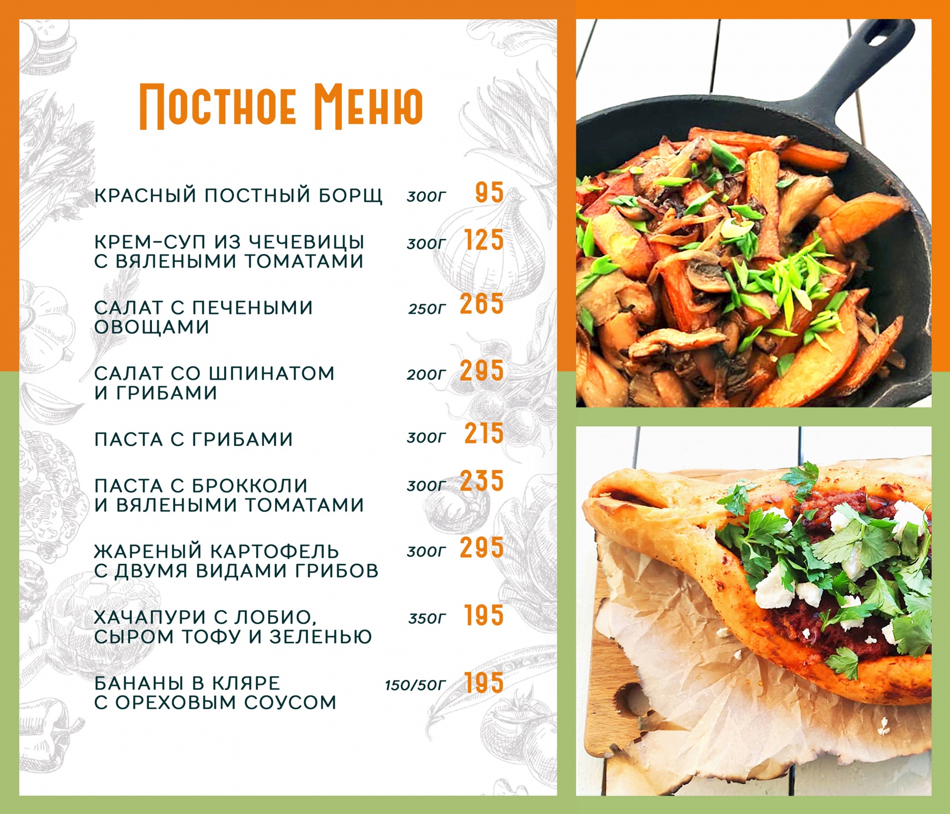Горячее: паста с грибами, паста с брокколи и вялеными томатами, жареный картофель с двумя видами грибов, хачапури с лобио, сыром тофу и зеленью - от 215 руб.