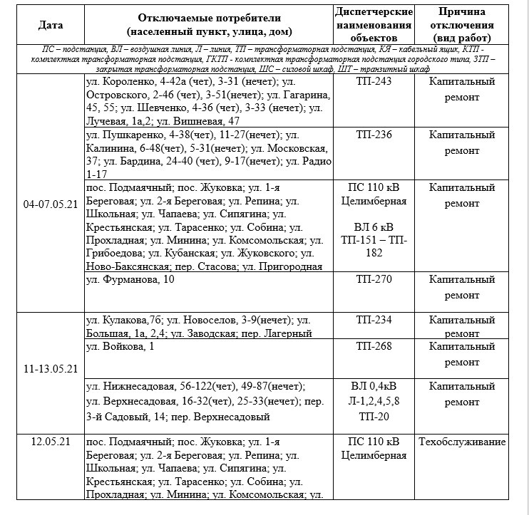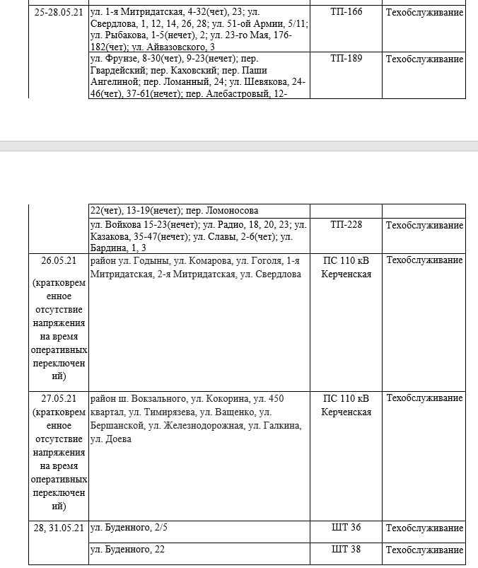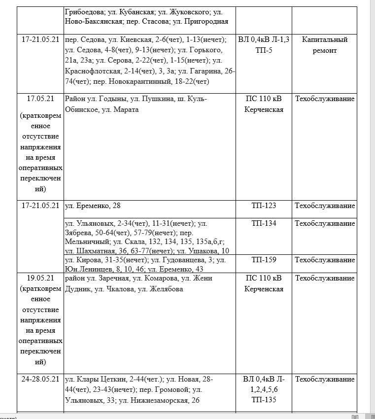 В связи с плановым ремонтом электрооборудования в мае в период с 8 до 17 часов будут происходить отключения линий электропередачи согласно нижеприведенному графику. Об этом сообщает ГУП РК «Крымэнерго», - передает Керчь.ФМ.
