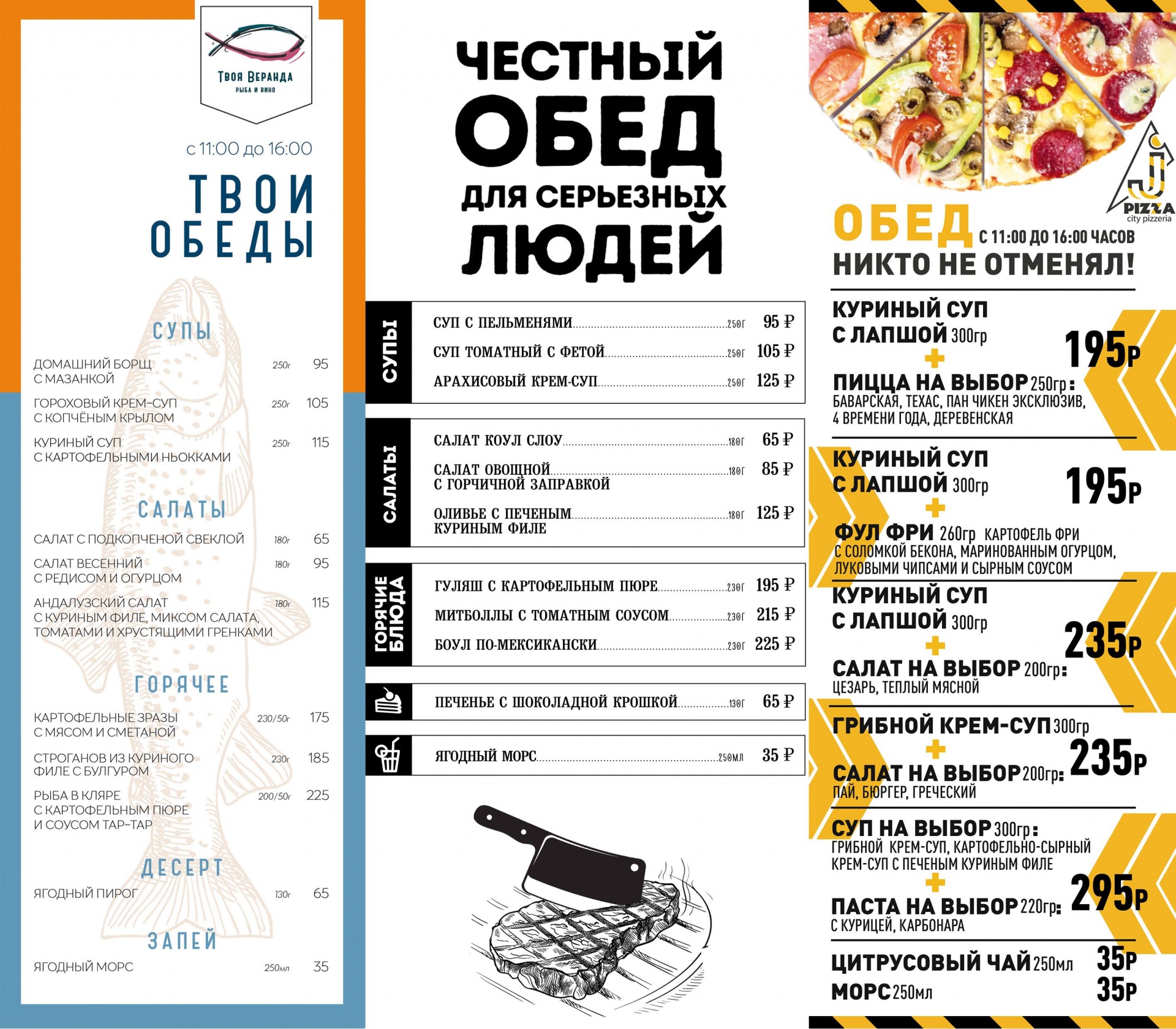 Всю неделю с понедельника по пятницу с 11:00 до 16:00 готовим обеды по честным ценам.