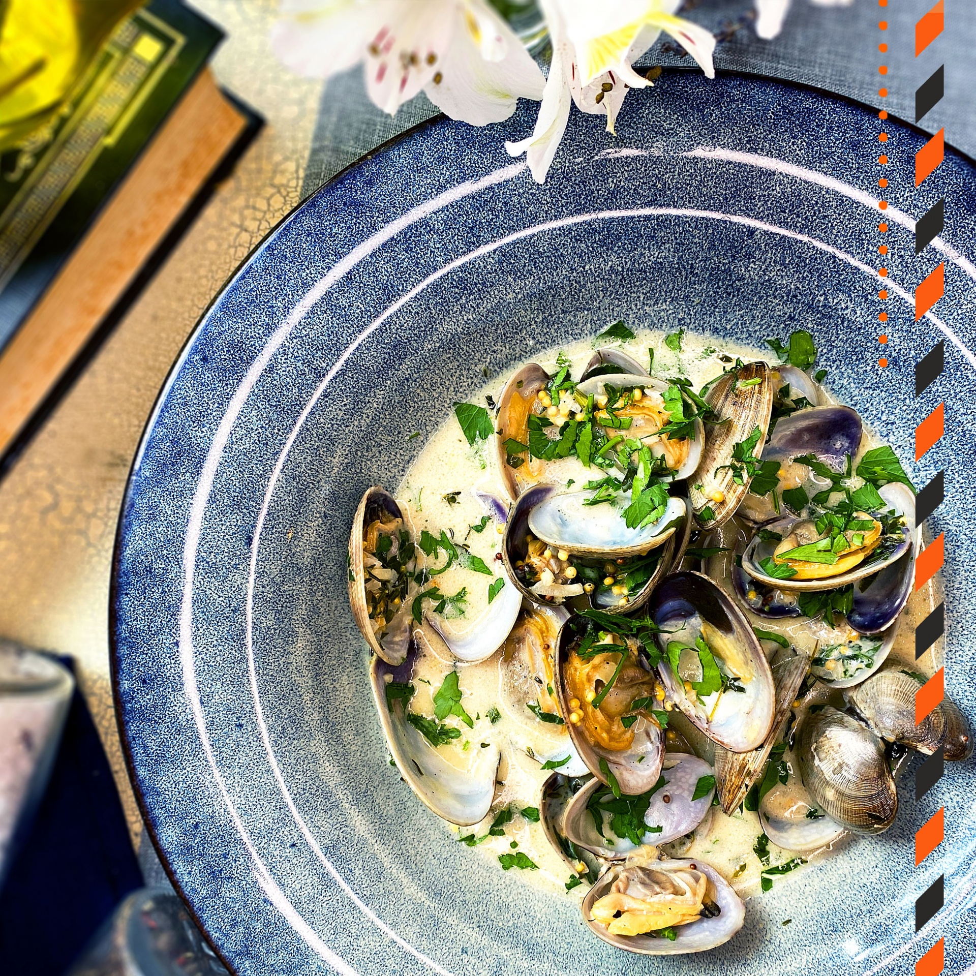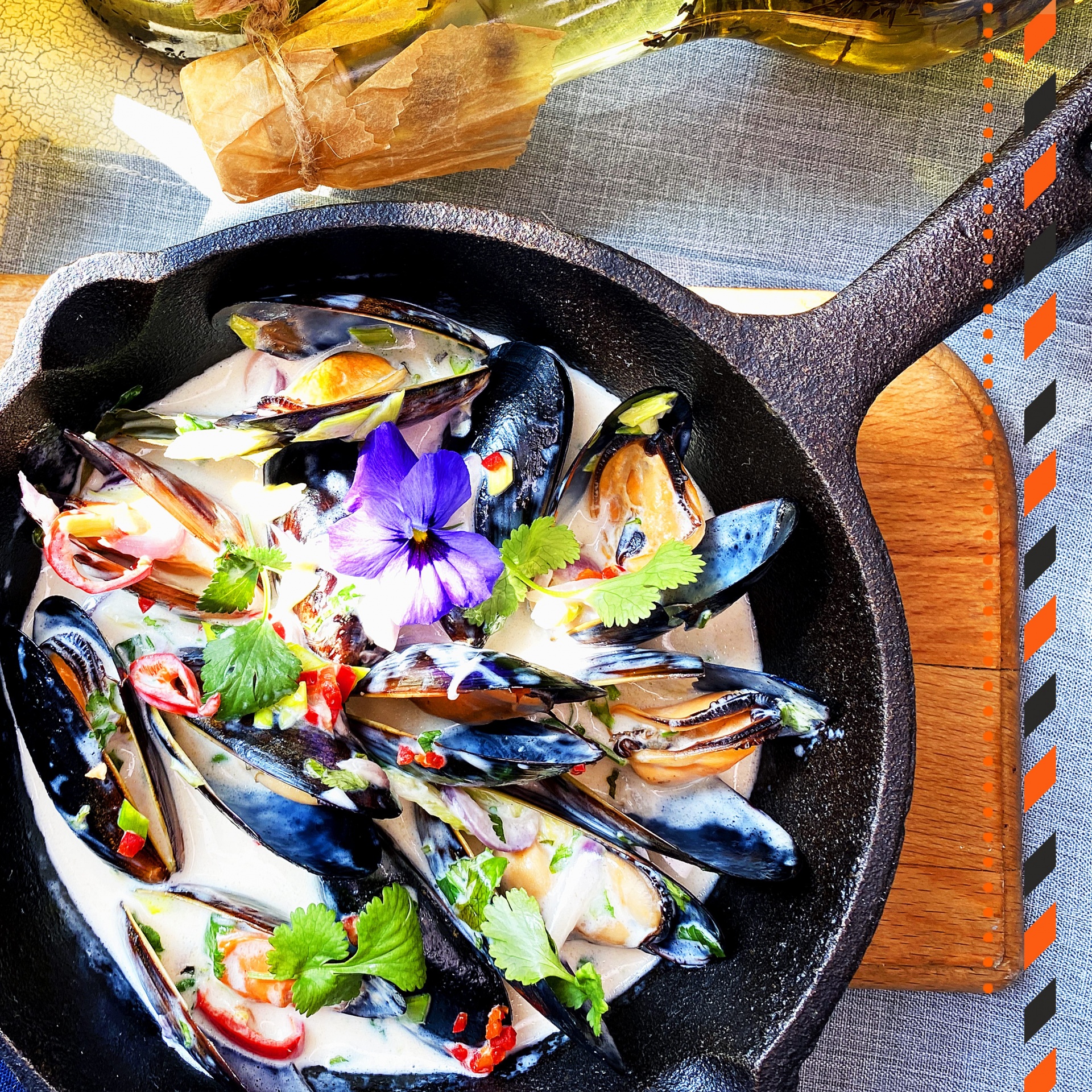 - Мидии в створках в белом соусе с сельдереем, чили перцем и кинзой.