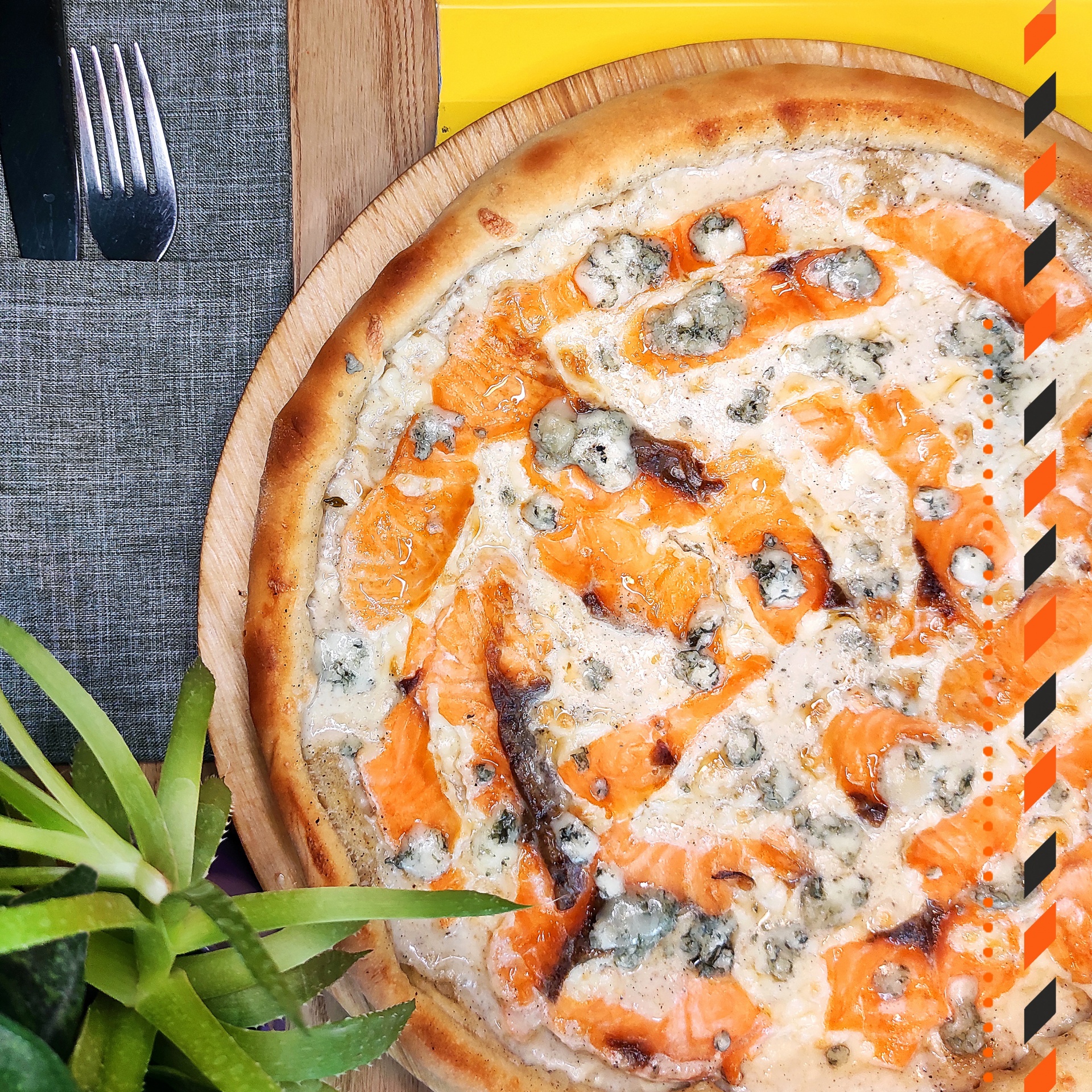 - Пиццу с лососем, голубым сыром и моцарелла на сливочном соусе.