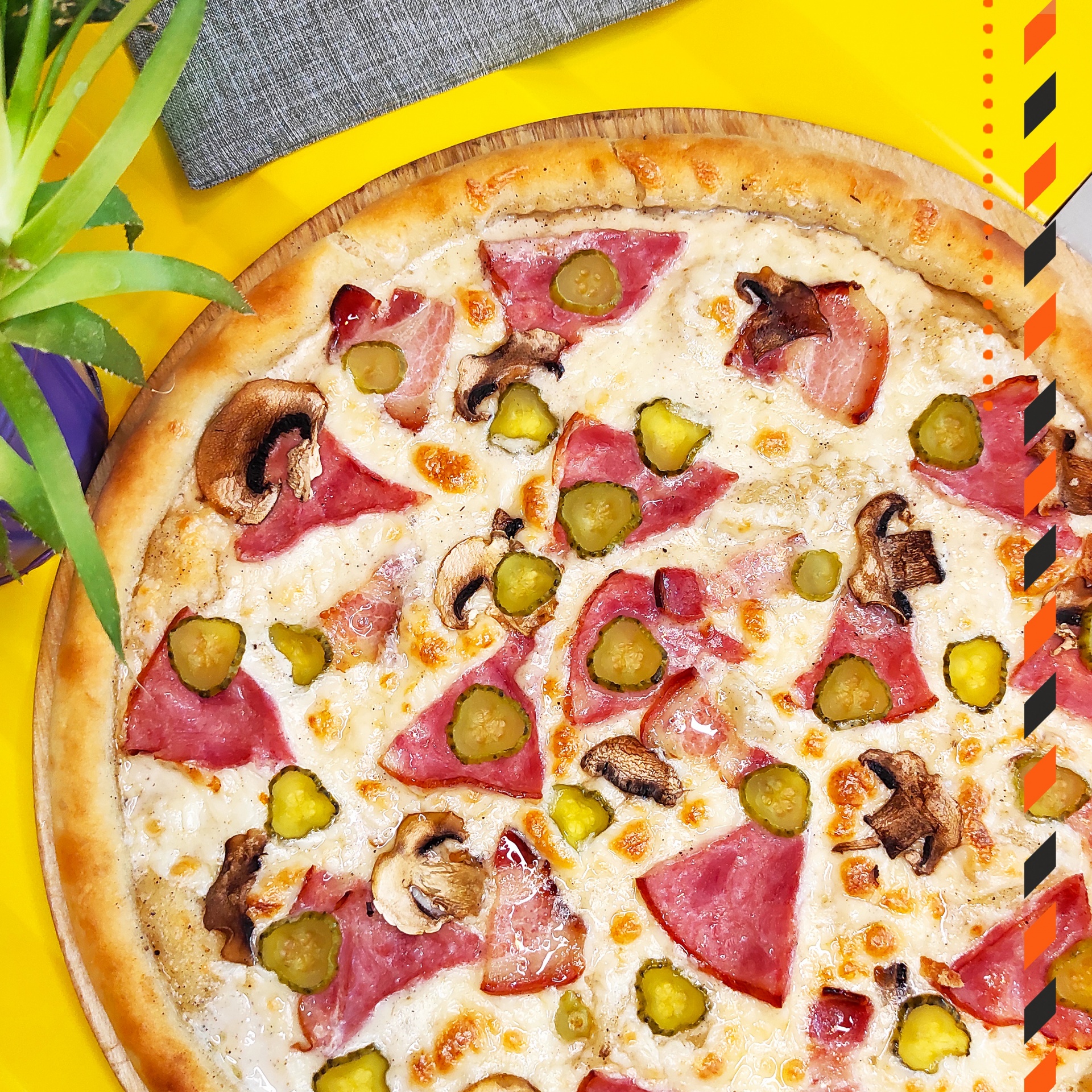 - Пиццу Пумба с ветчиной, беконом, шампиньонами, маринованным огурцом, репчатым луком, сыром моцарелла на сливочном соусе;