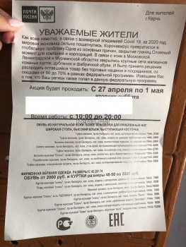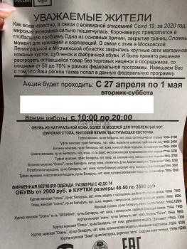 «Захожу в подъезд, а там этой рекламы накидали. И в каждый ящик, и на пол. Ну вот решили глянуть, кто такие наглые.  А тут не просто распродажа, а еще и текст большой, что проходит Федеральная программа, в рамках которой распродают обувь и дубленки. Ну какая, какая программа? Где Роспотребнадзор, который должен штрафовать за такое. А пенсионеры же ведутся, что им лапшу вешают. Я не против, что люди приезжают сюда торговать, но зачем обманывать какими-то программами», - написали читатели.