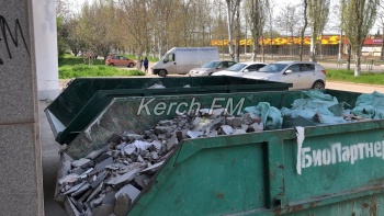 У входа стоят контейнеры, куда сразу складывают строительный мусор. Территория перед входом ограждена ящиками, чтобы водители не парковали свои автомобили.