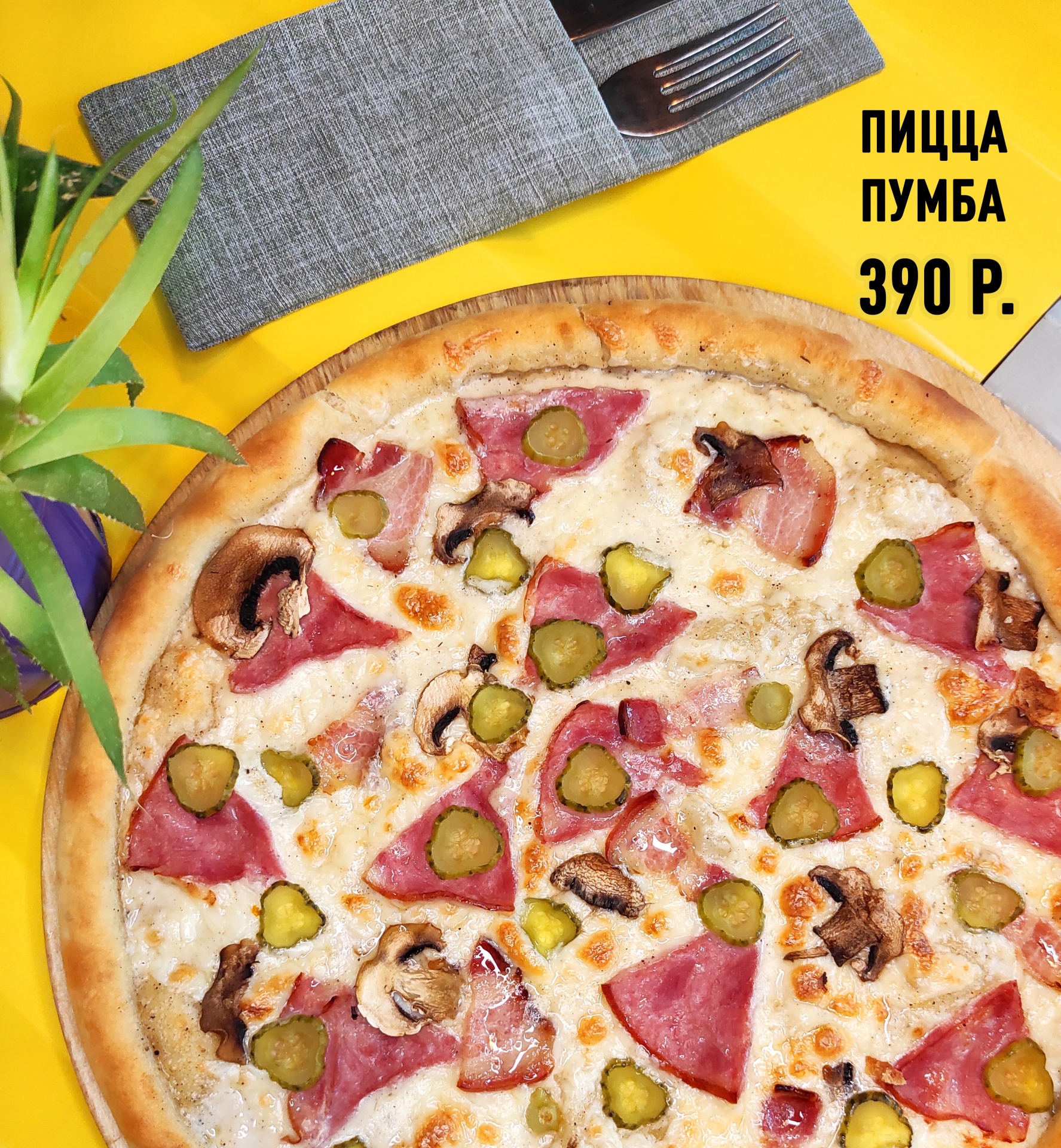 - Пиццы Пумба с ветчиной, беконом, шампиньонами, маринованным огурцом, репчатым луком, сыром моцарелла на сливочном соусе;
