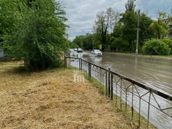 В данном месте находится ливневка, но даже со слабым ливневым дождем ей не удалость справится.